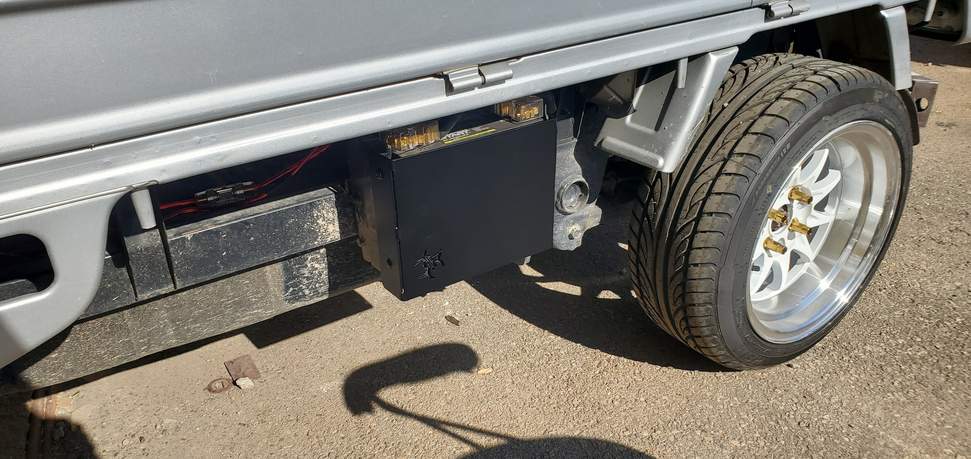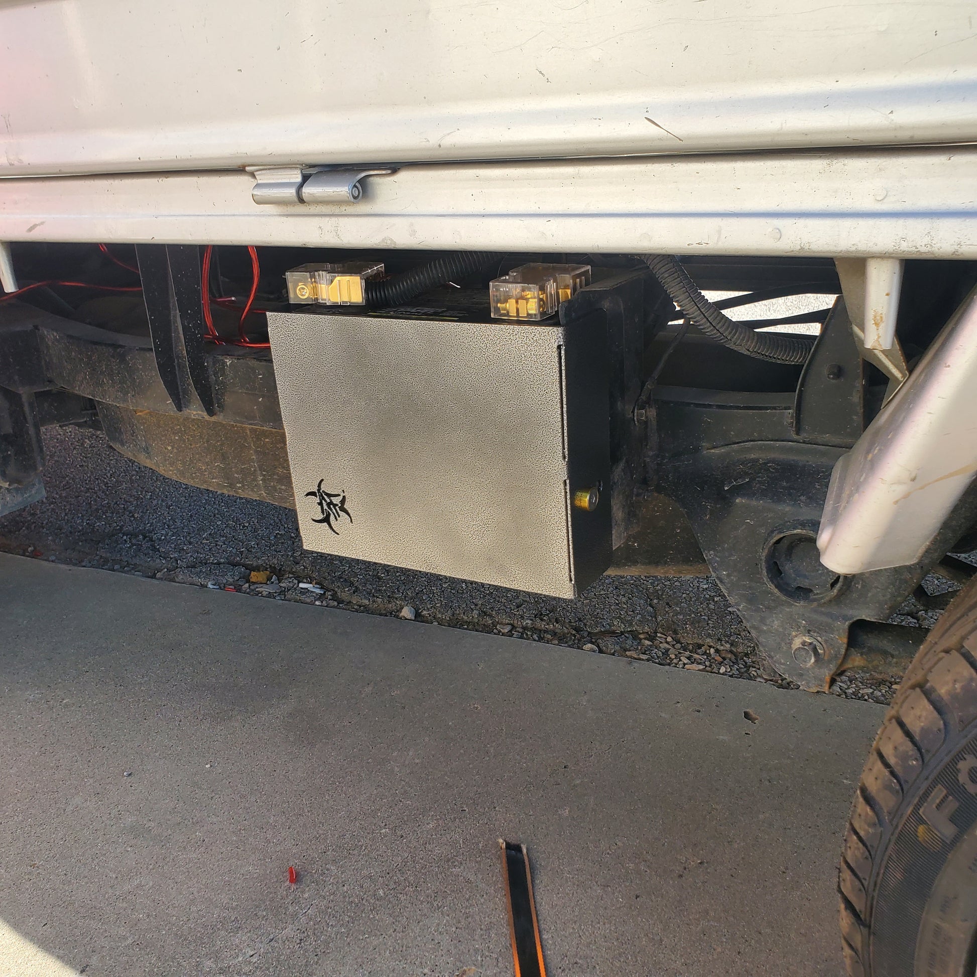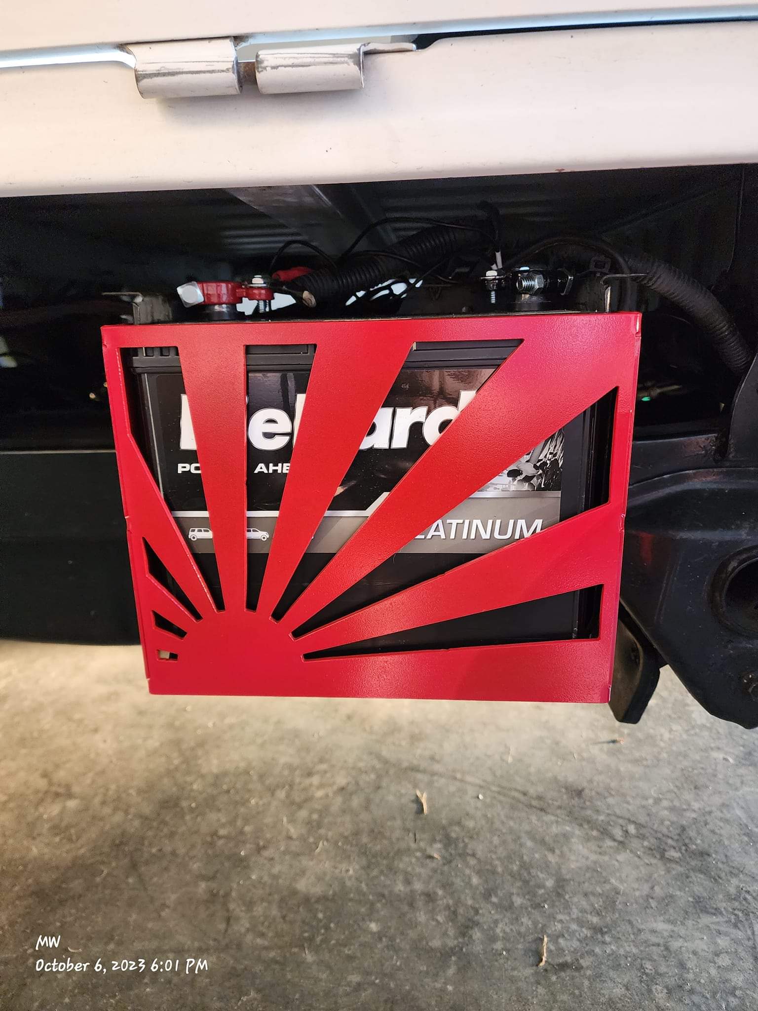plasma cut, bent and powdercoated. Multiple designs available. Cover has two pins that slide into the existing holes on the front of the box and they work as a hinge where the single adjustable M8 stainless steel Bolt will tighten the cover down and hold it in place. The cover has enough adjustment to allow a gap between the battery and the cover, where you can add a light to accent the cutout on the cover.